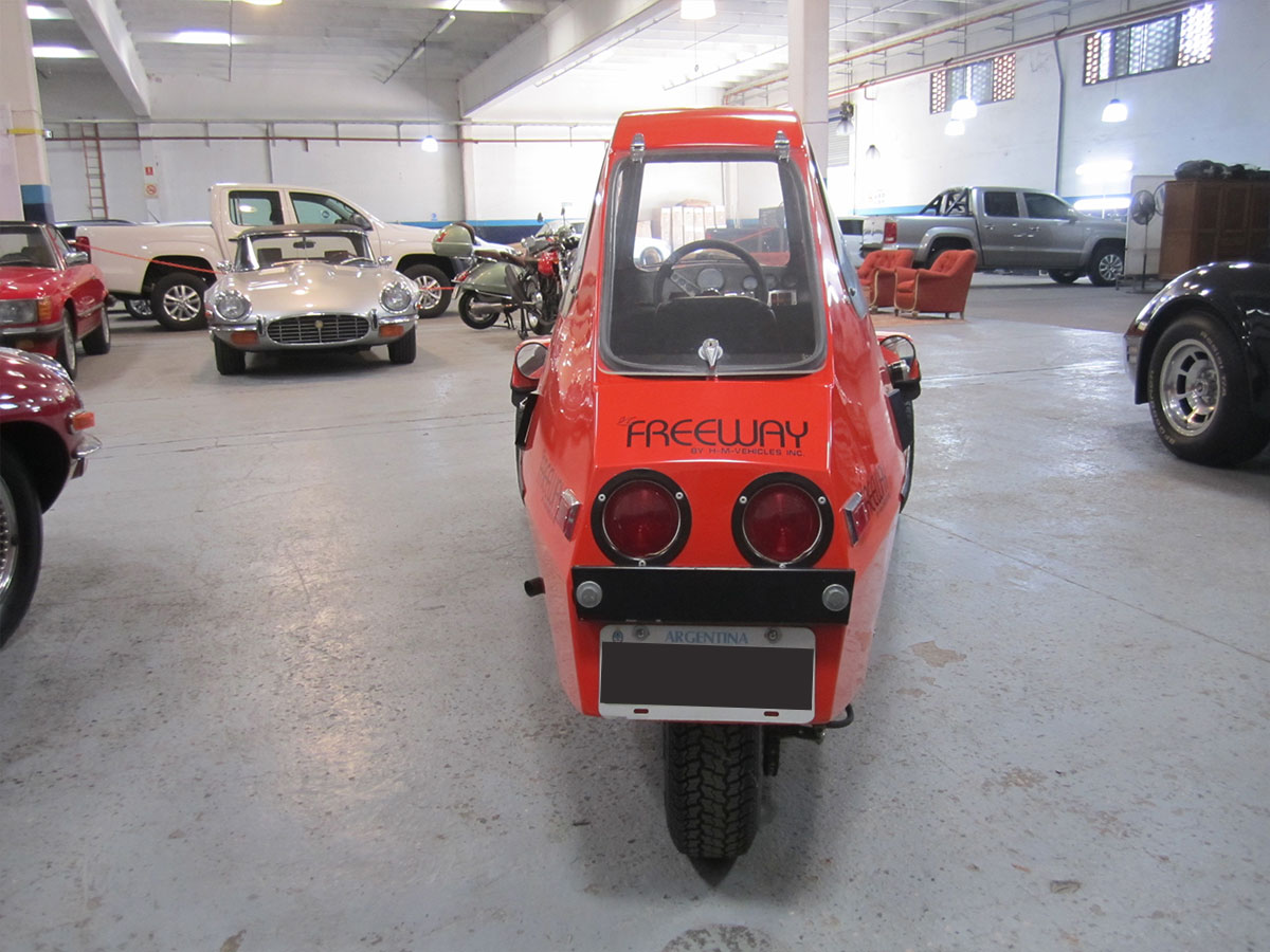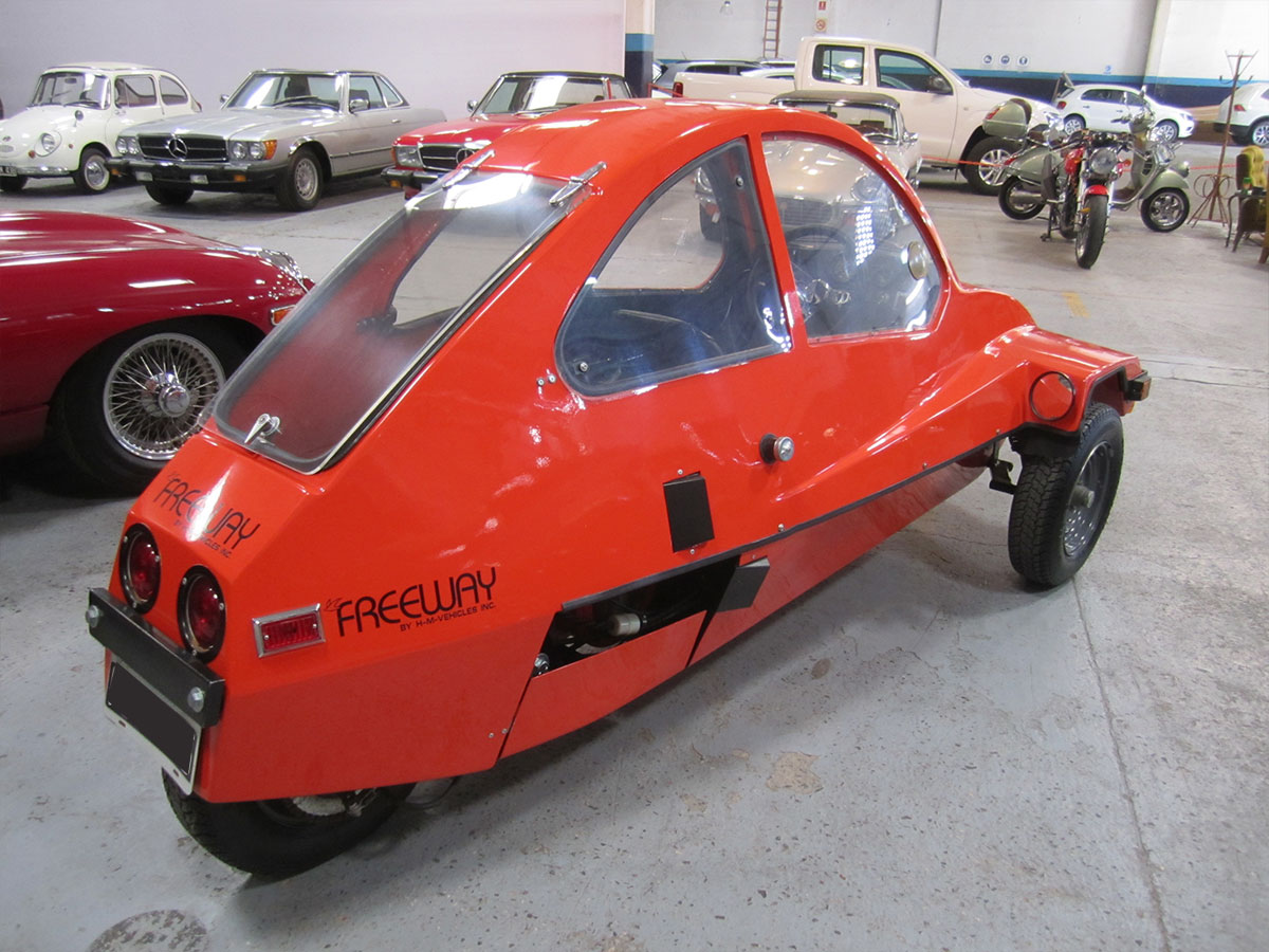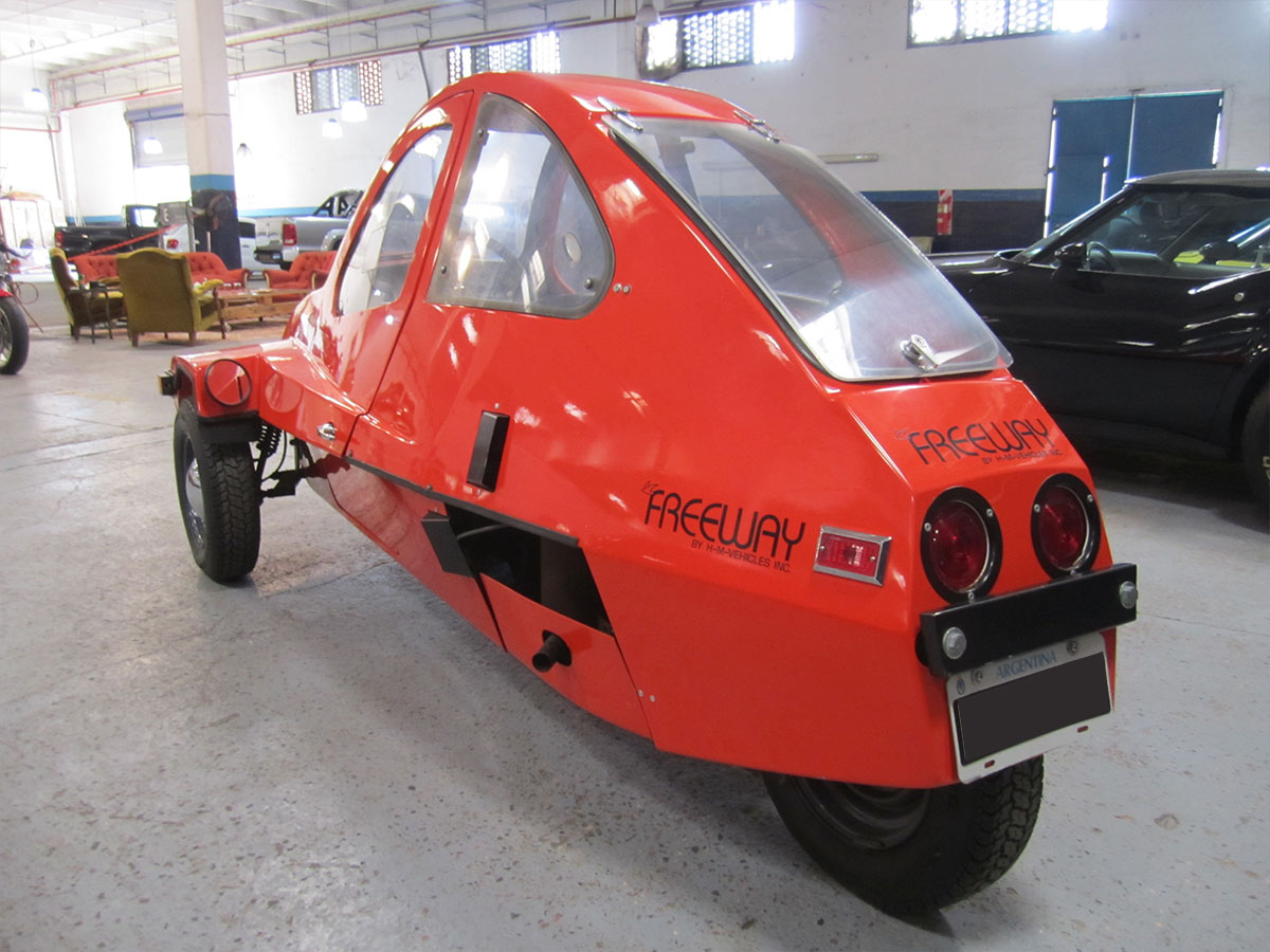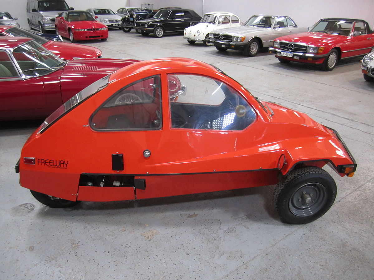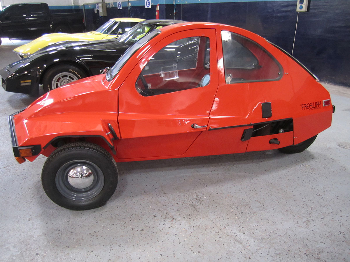 El FreeWay fue fabricado por High Mileage Vehicles, Inc. de Barnsville, MN, una creación de un ingeniero llamado Dave Edmonson. Con FreeWay, Edmondson llevaría el transporte básico a los extremos de lo básico. Tenía 1 puerta, 1 asiento, 1 faro y un motor de 1 cilindro. Este minicar con cuerpo de fibra de vidrio y 700 libras en forma de casco se parecía menos a un automóvil y más a una motocicleta cerrada. De hecho, uno de los argumentos de venta de HMV fue que la FreeWay podría registrarse como motocicleta. Pero no necesitaba un casco, presumiblemente porque estaba conduciendo uno.