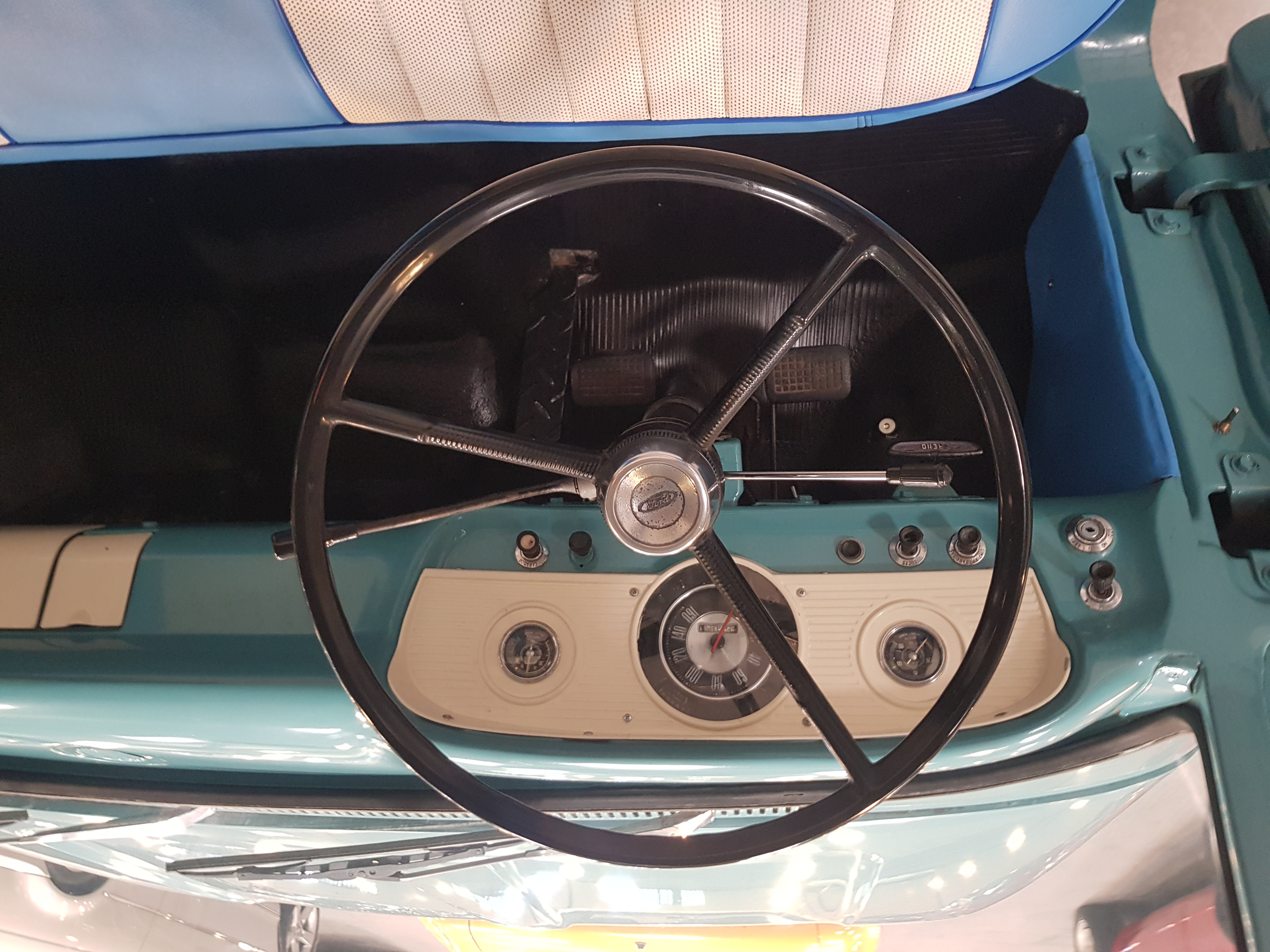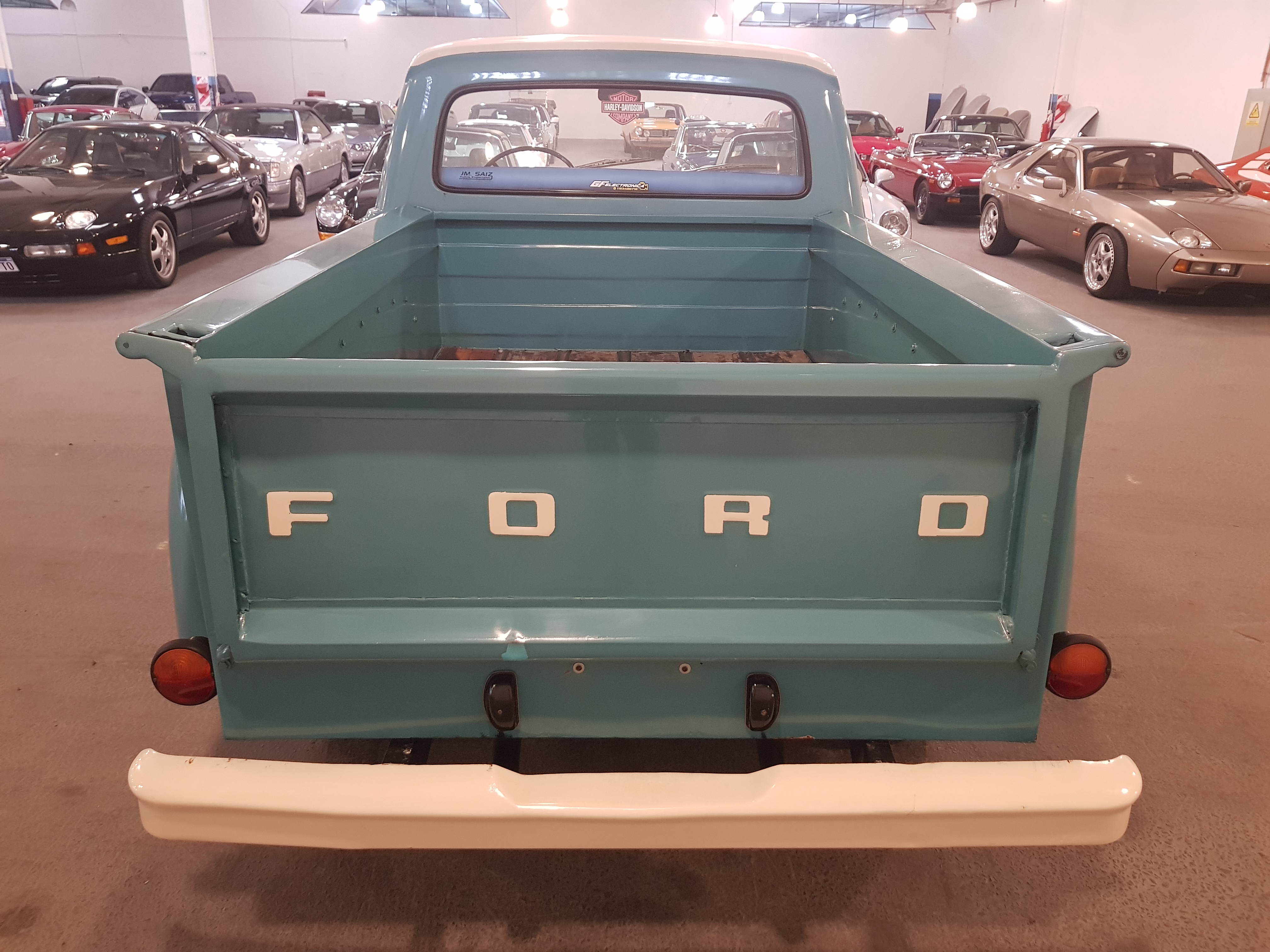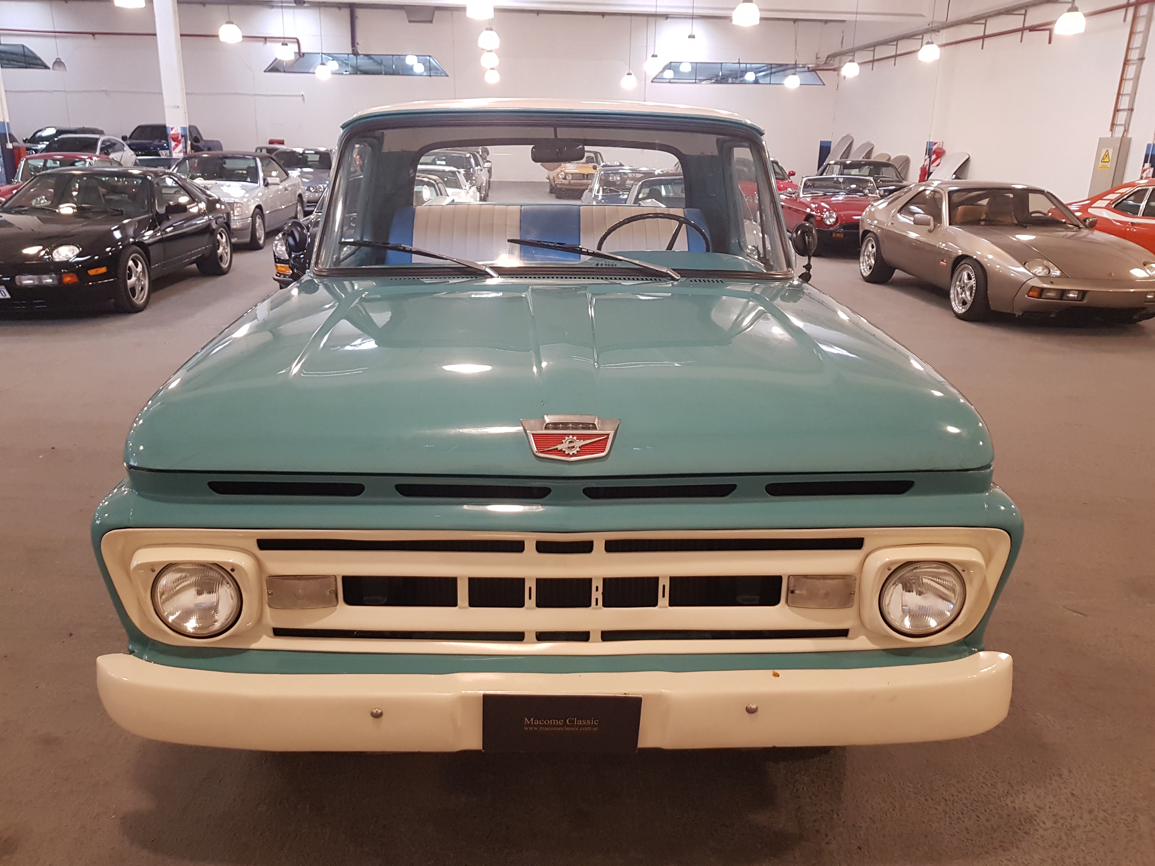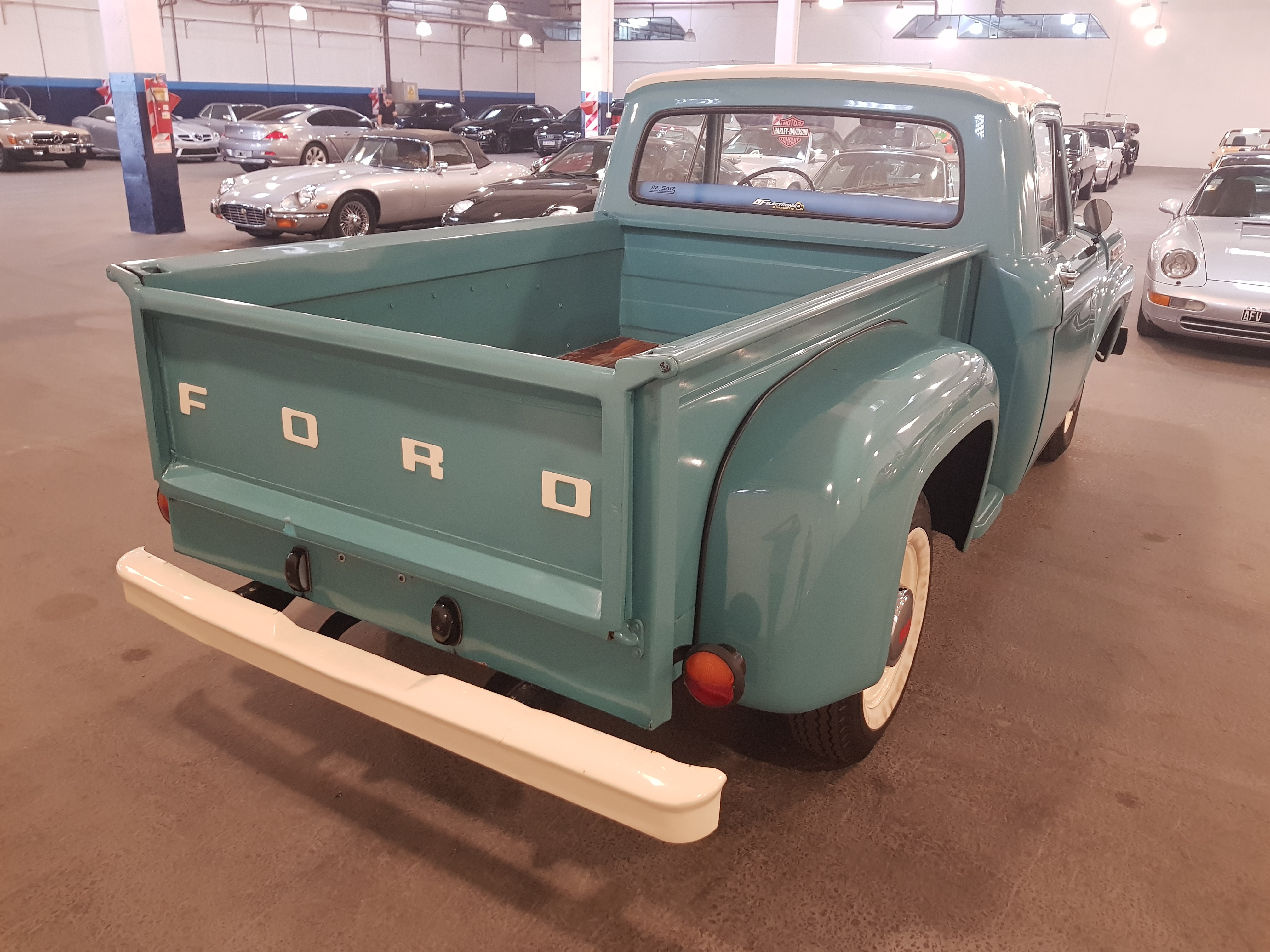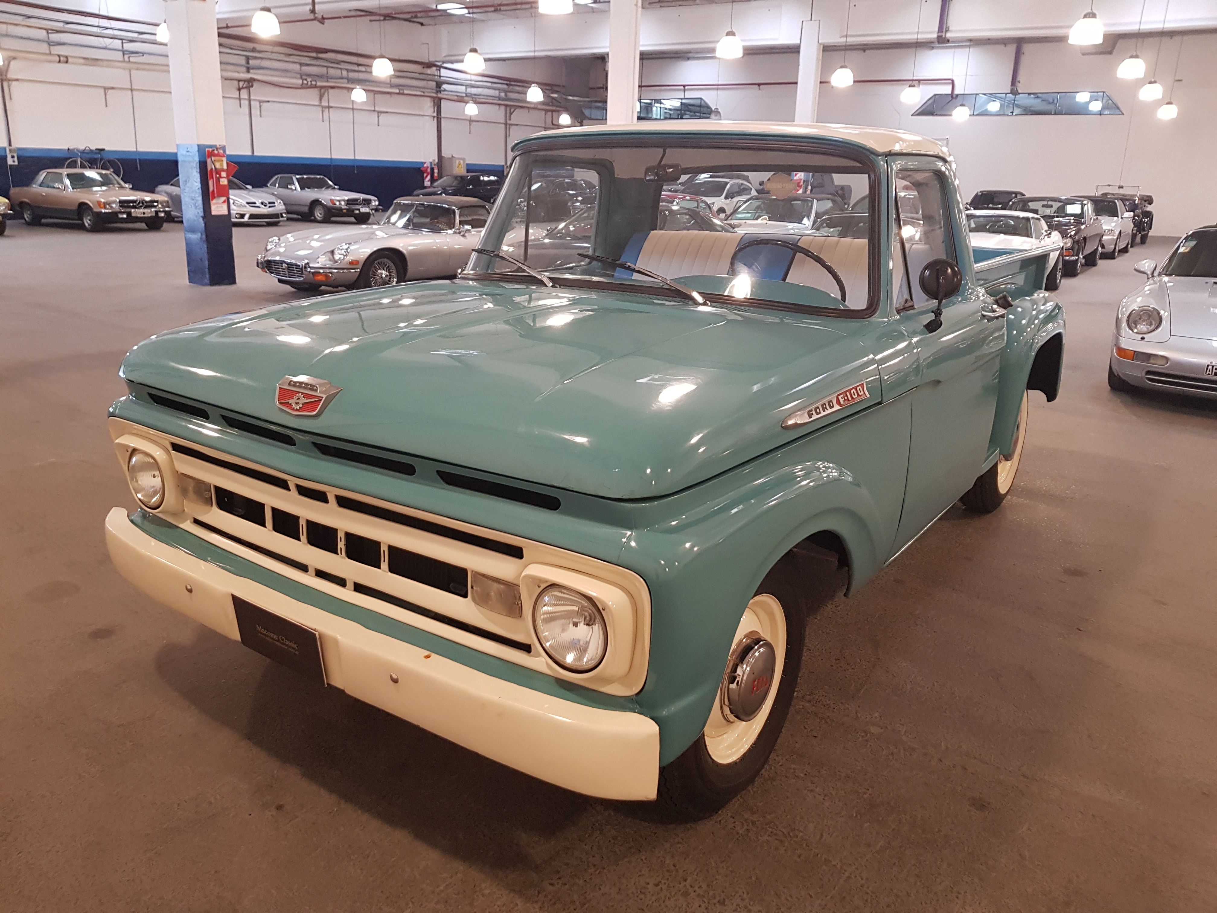 Ford F100 Año: 1961; Color exterior: Celeste y Blanco; Interior: Cuero Celeste y blanco; Carrocería: Pick Up; Puertas: 2; Plazas: 2; Motor: V8 292 4.8; Cilindrada: 4785 cc.; Potencia Máx.: 160 cv / 4000 rpm; Par Máx.: 366 nm / 2000 rpm; Transmisión: Manual 3 vel y marcha atrás; Dirección: Mecánica; Kilometraje: 23.231 Km; Combustible: Nafta.